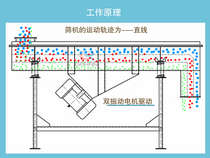DZSF系列直線振動篩為雙振動電機驅動。當兩臺振動電機做同步、反向旋轉時,其偏心塊所產生的激振力在平行于電機軸線的方向相互抵消,在垂直于電機軸的方向疊為一合力,因此篩機的運動軌跡為一直線。兩電機軸相對篩面在垂直方向有一傾角,在激振力和物料自重力的合力作用下,物料在篩面上被拋起跳躍或向前作直線運動,從而達到對物料進行篩選和分級的目的。適用于粒度在0.074—5mm,含水量小于7%,無粘性的各種干式粉狀或顆粒狀物料的篩分。給料粒度不大于10mm。